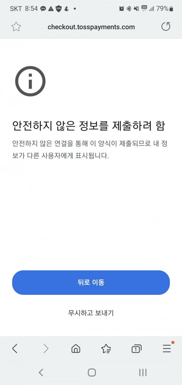 하나카드로 결재할려고 하는데 자꾸 오뮤가 뜨네요... 마지막 승인을 했는데 "안전하지 않는정보를 보내려고 함." 확인부탁드립니다.