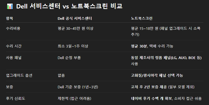 노트북 액정은 실제로 정품 OEM 패널을 사용하는 사설 전문점이 더 가성비가 좋은 경우가 많습니다. Dell도 예외는 아닙니다.